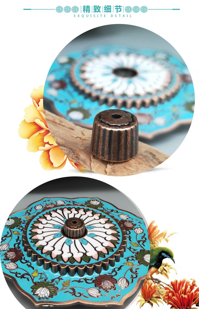 Finished with vibrant enamel colors through high-temperature firing, each piece showcases intricate floral patterns and a brass incense mount at the center. Available in soft turquoise or deep royal blue, both colorways evoke a sense of serenity and cultural depth.