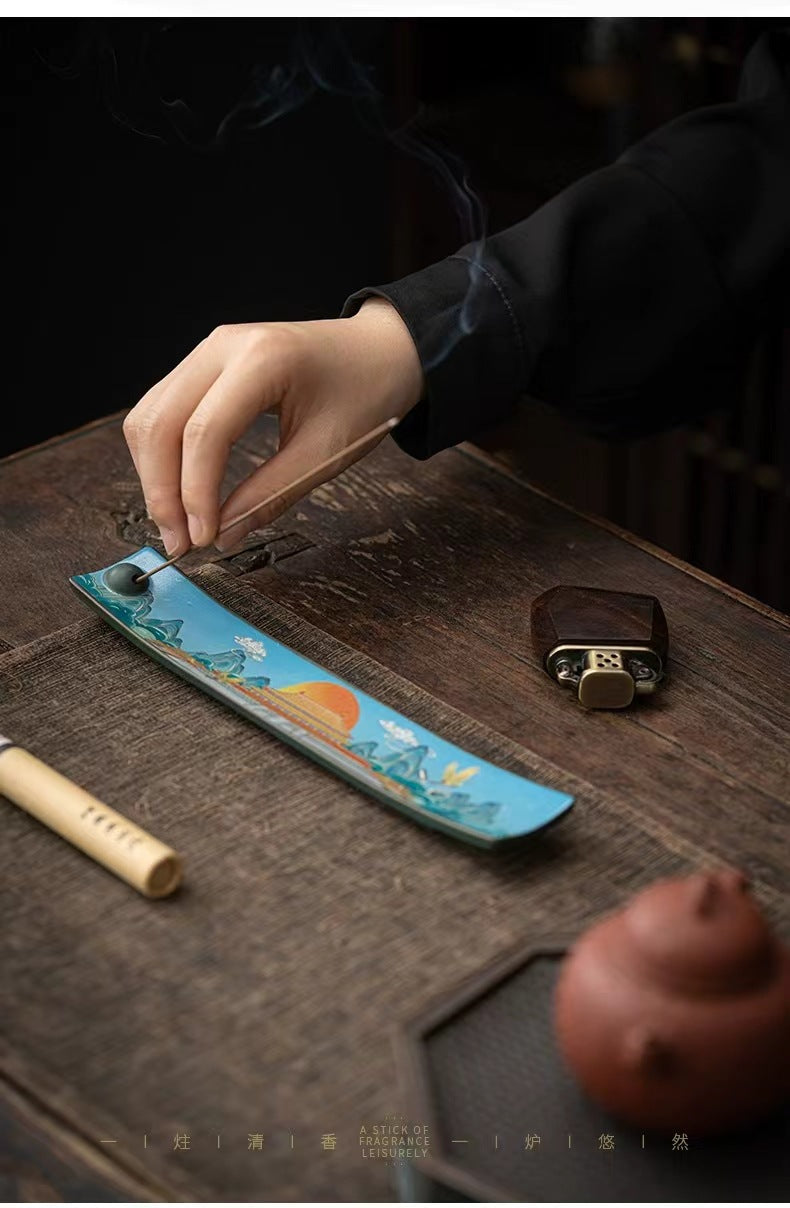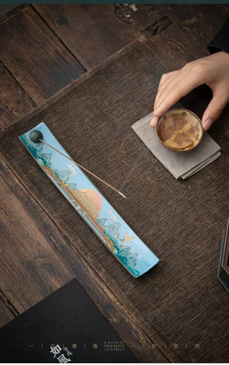 Crafted with refined enamel artistry, this incense holder features vibrant, intricate designs inspired by traditional Chinese culture—soaring dragons, serene landscapes, lotus flowers, and imperial architecture.