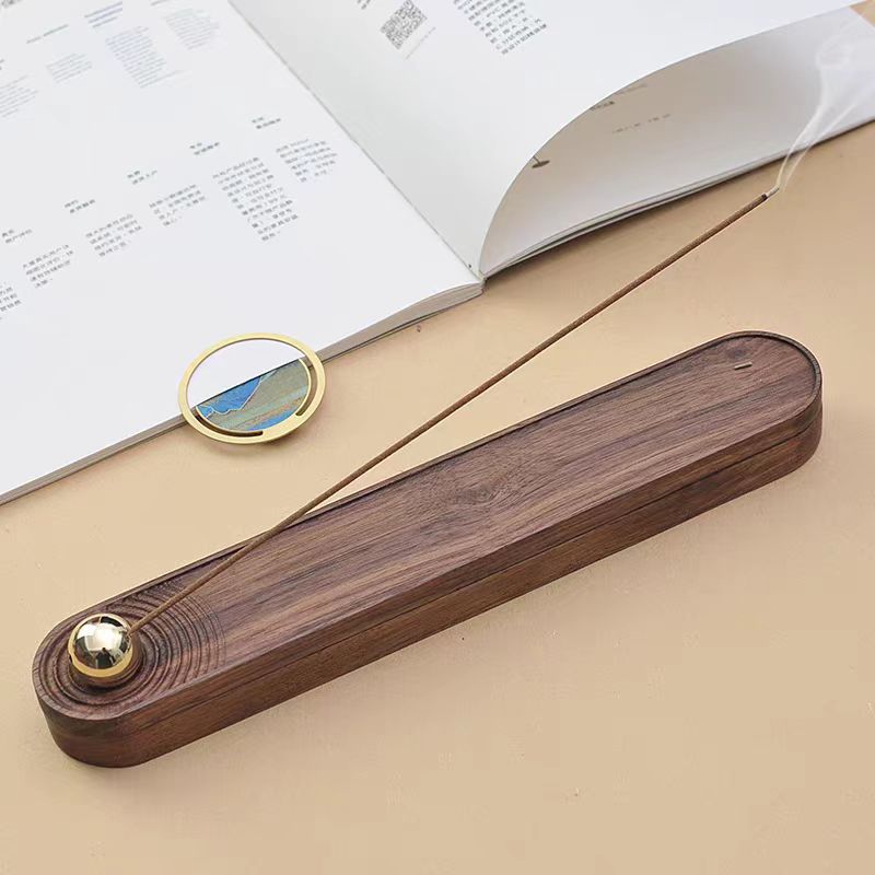 A delicate brass sphere is embedded at one end to hold the incense stick firmly in place while adding a refined metallic detail. The ash falls naturally onto the wooden base, keeping the surface clean and easy to maintain.
